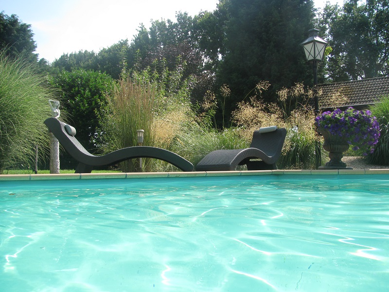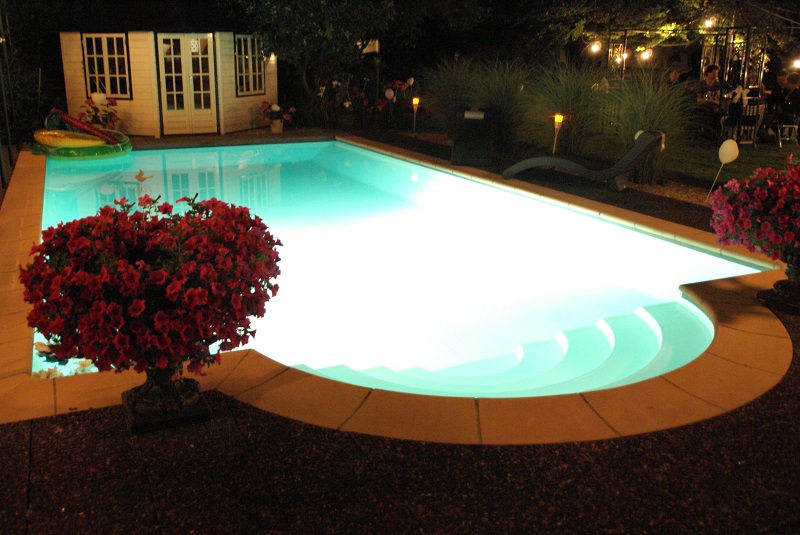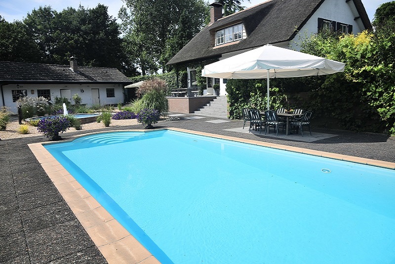 Zwembad afmeting 5 x 10 Solar lamellenafdekking wegwerkt in een houten nis. Verlichting d.m.v. halogeenspots. Techniek in het poolhouse. Verwarming middels zonnecollectoren. Romeinse trap.