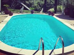 7,5×3,5 Prefab liner lichtblauw RVS trap Lichte beton tegels Blauwe noppen afdekking manueel LED verlichting Verwarming met CV ketel Poolcontrol zwembadbesturing