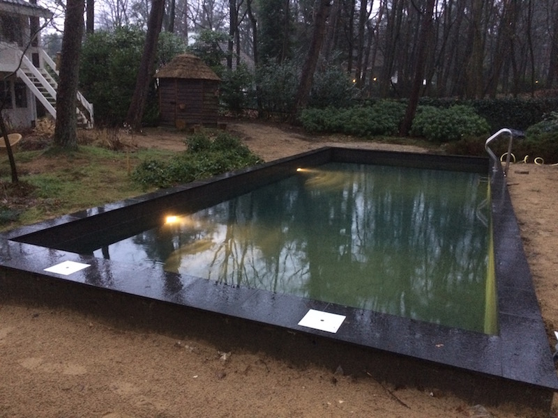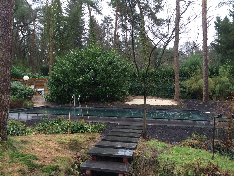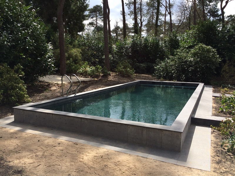 Nieuw uniek concept zonder afwerking in het bad, zwembad uitgevoerd met antraciet kleurig beton.