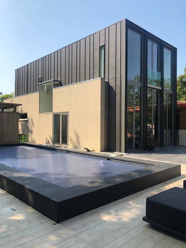 Automatisch Polycarbonaat lamellenafdekking met solarfunctie, gemonteerd onder de bouwkundige zitbank.