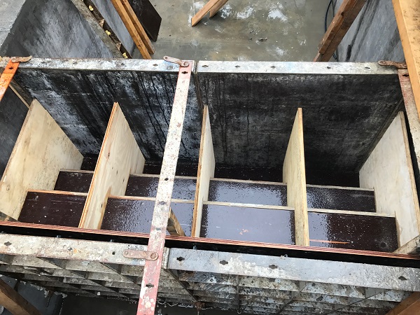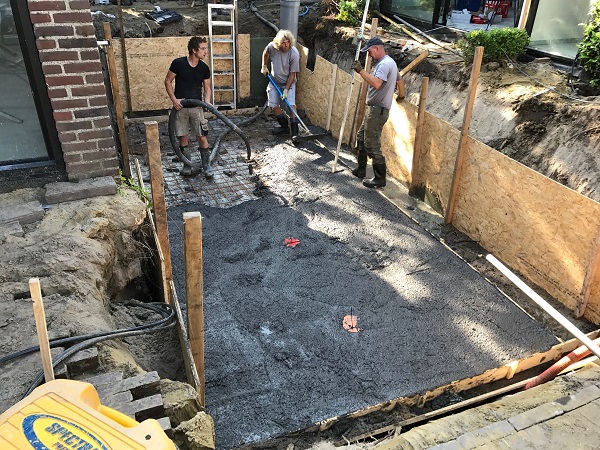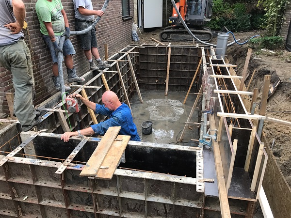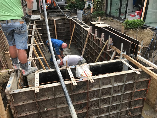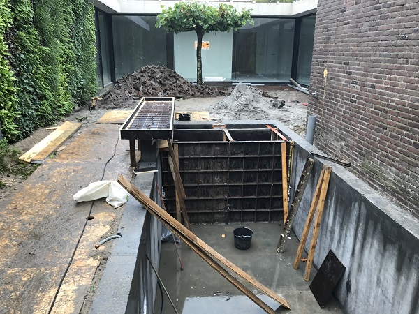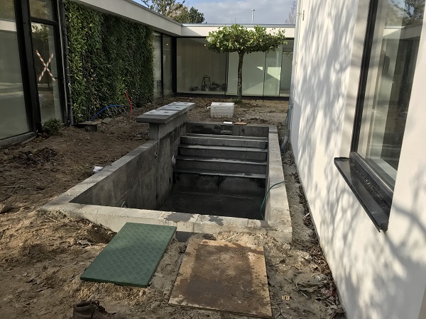 Waterdicht betonnen bassin, beton met antraciet kleurtoeslag.